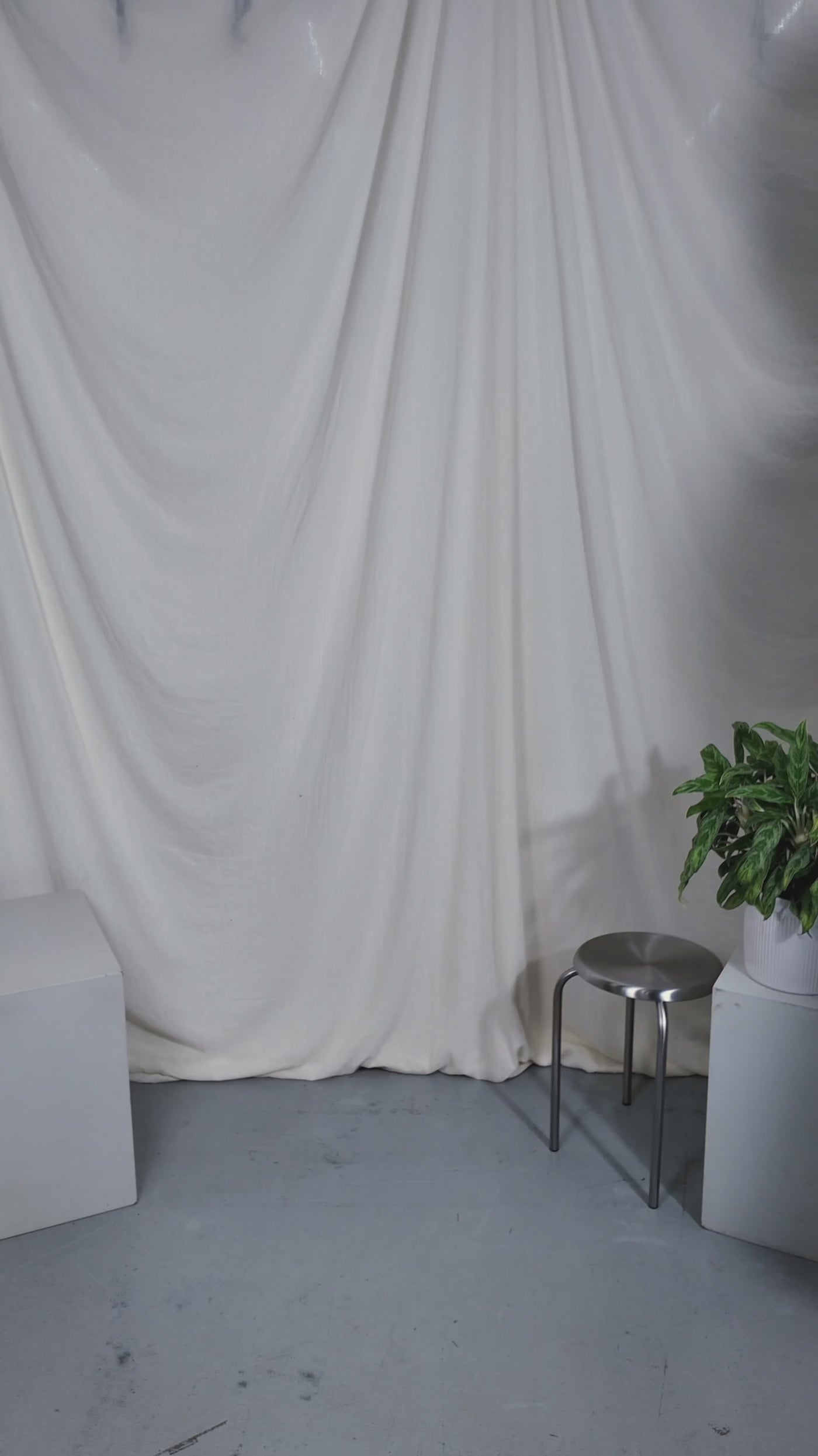 Two people sitting on a stool in a studio setting with photography equipment.