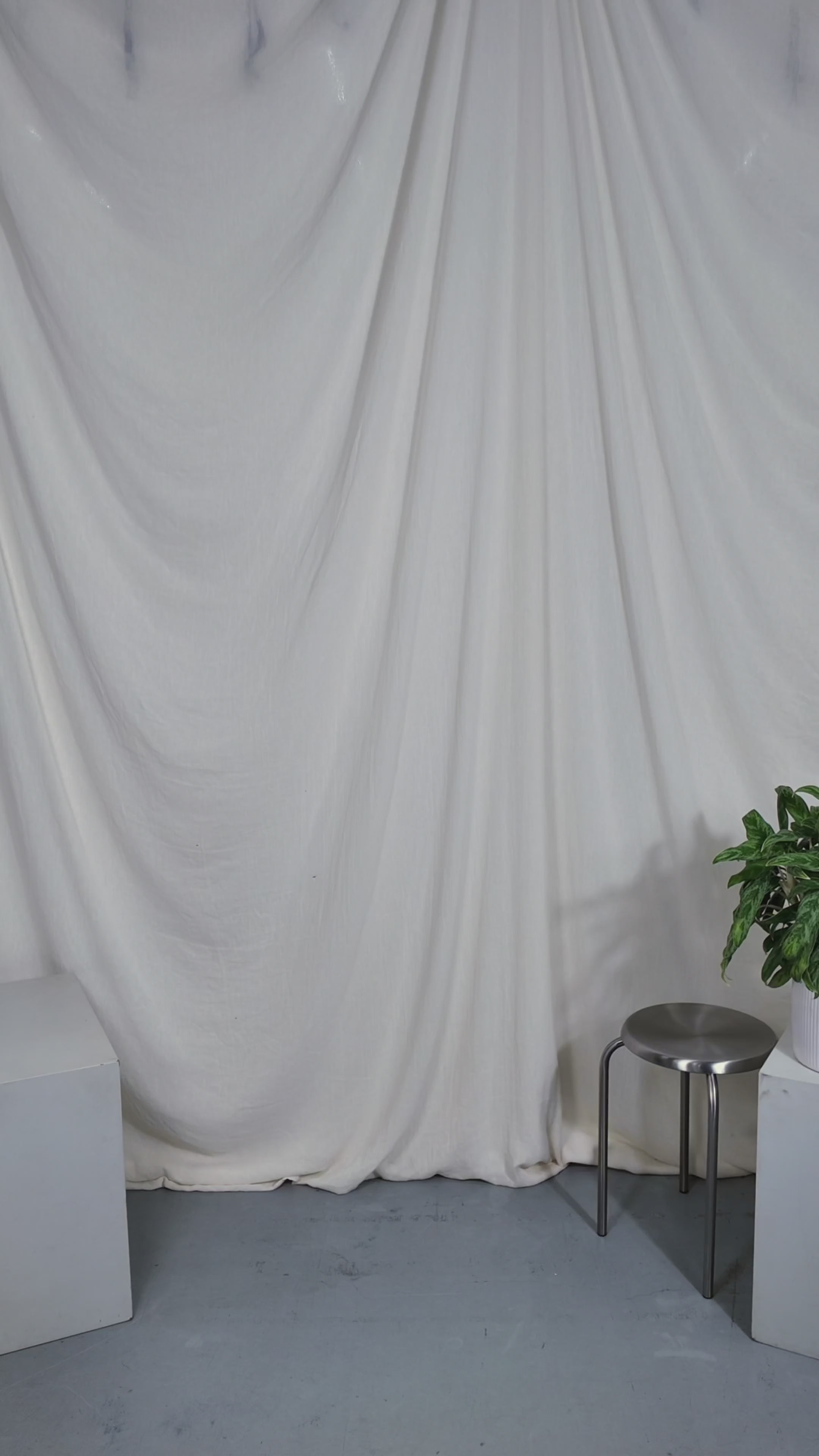 Two people sitting on a stool in a studio setting with photography equipment.